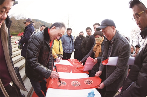 “春風(fēng)張笑靨,一山鶴氣銜龍氣;泰歲兆豐年,萬(wàn)樹(shù)梅紅映夢(mèng)紅”,云龍山西門(mén)處懸掛的這副春聯(lián)由徐州市書(shū)法家協(xié)會(huì)主席馬亞書(shū)寫(xiě),筆力遒健的書(shū)法與云龍山大氣磅礴的牌坊相得益彰。“旖旎望彭城,秀色鋪開(kāi),春山十里同招鶴;昂揚(yáng)歌漢韻,大風(fēng)振起,云路千重再翥龍”,由江蘇省書(shū)法家協(xié)會(huì)副主席謝少承書(shū)寫(xiě)的北門(mén)春聯(lián),也于當(dāng)日揭開(kāi)神秘面紗。