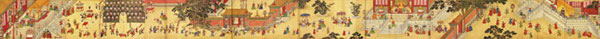 《明憲宗元宵行樂圖卷》長624厘米,寬37厘米。構(gòu)圖嚴(yán)謹(jǐn),筆法細(xì)膩,畫面上的宮廷院落巍峨壯觀,各種人物的情態(tài)、動作細(xì)致入微,繁而不雜,多而不亂,它描繪的是明朝成化年間皇宮里過元宵節(jié)的各種情景,每幅場景都有憲宗皇帝在場,他穿著不同的盛裝,或站,或坐,表情安詳,在欣賞著元宵節(jié)的各種活動。