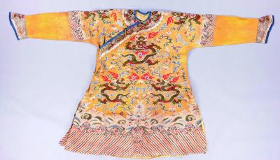 清代五彩緙絲織孔雀羽龍袍