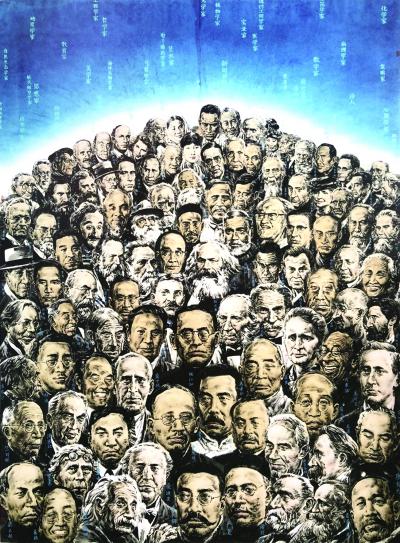 《世紀(jì)智者》長(zhǎng)252厘米、寬168厘米,是一幅世界人文智者群像圖,人類文化方方面面的代表人物出現(xiàn)在同一個(gè)畫面上,從托爾斯泰、馬克思、愛(ài)因斯坦到梅蘭芳、郭沫若、錢學(xué)森……數(shù)以百計(jì)的頭像構(gòu)成“智者”的星球。這些各個(gè)領(lǐng)域的先行者,以整齊的隊(duì)列密密匝匝占據(jù)著畫面的五分之四,觀眾則在仰視中無(wú)聲地與智者對(duì)話,感受著先導(dǎo)者們思想的張力和歷史文明的厚重。作品中的后排人物組合形成一條弧形的地平錢,暗示歷史的縱深和隊(duì)列的無(wú)盡。人物背后則是剛剛露出魚肚白的天際和漸次上升的曙青色——這是黎明前濃重的青藍(lán)交混的過(guò)渡色彩。此外,在象征了宇宙蒼穹的青藍(lán)天際中綴滿或隱或現(xiàn)的銀色文字——思想家、哲學(xué)家、歷史學(xué)家、教育家等字樣,宛若廣袤天際中的各類星辰。