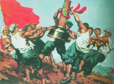 1950年,中央人民政府在北京召開了表彰全國(guó)戰(zhàn)斗英雄代表大會(huì)以及全國(guó)工農(nóng)兵勞動(dòng)模范代表大會(huì),在全國(guó)掀起了向勞模學(xué)習(xí)的熱潮。同年,中央美術(shù)學(xué)院發(fā)起了為勞模畫速寫的運(yùn)動(dòng),吳作人的油畫《特等勞動(dòng)英雄李永像》在此背景下誕生,并受到徐悲鴻等業(yè)內(nèi)專家的贊賞。隨著經(jīng)濟(jì)建設(shè)的發(fā)展,大批表現(xiàn)壯闊勞動(dòng)場(chǎng)景的繪畫被創(chuàng)作出來(lái)。如表現(xiàn)北大荒墾荒建設(shè)的詹建俊的《起家》和汪誠(chéng)一的《遠(yuǎn)方來(lái)信》,表現(xiàn)十三陵水庫(kù)建設(shè)的王式廓的《十三陵水庫(kù)》、艾中信的《十三陵雷雨》,以及描繪婦女勞動(dòng)者的王文彬的《夯歌》等!镀鸺摇访枥L了北大荒青年初到邊疆安營(yíng)扎寨的場(chǎng)面:滿目的荒草,烏云密布,行李散放一地,一張用來(lái)支帳篷的白帆布迎風(fēng)飛揚(yáng)。惡劣的環(huán)境更加襯托出青年拓荒者堅(jiān)韌不拔的力量和戰(zhàn)勝一切的斗志。而《夯歌》則刻畫了一群勤勞的婦女邊唱歌邊打夯的火熱場(chǎng)景。畫面中山脊橫向起伏的線條與主體人物輻射狀的構(gòu)圖形成極具張力的視覺效果。陽(yáng)光明媚,笑容燦爛,勞動(dòng)者身上散發(fā)出耀眼的光芒,這是新中國(guó)成立以來(lái)婦女勞動(dòng)者的典型形象。