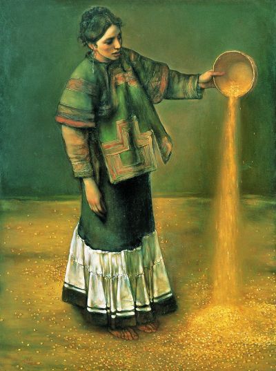 龐茂琨的《揚(yáng)》用古典主義的方式刻畫了一個(gè)彝族女子灑下玉米粒的溫暖一刻;揖G的背景襯托金色的玉米粒,糧食意味著生命的延續(xù)。細(xì)膩的筆觸惟妙惟肖地呈現(xiàn)出女子勞動(dòng)的身形和自然祥和的神情。這是一首關(guān)于勞動(dòng)和收獲的贊歌,連時(shí)間也被凝固下來(lái),傳遞著一種靜謐永恒的美。