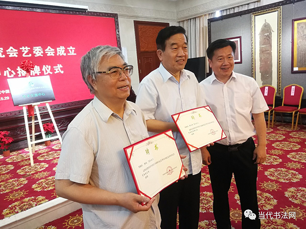 會(huì)上,中國(guó)書法家協(xié)會(huì)主席蘇士澍先生致辭,研究會(huì)會(huì)長(zhǎng)李少青宣布了藝術(shù)委員會(huì)組成名單和學(xué)術(shù)交流中心人員組成,并為蘇士澍、張飆頒發(fā)了藝委會(huì)名譽(yù)主任、主任聘書;蘇士澍主席、張飆主席為藝委會(huì)執(zhí)行主任、副主任頒發(fā)聘書;張飆主席、李少青會(huì)長(zhǎng)為藝委會(huì)委員和學(xué)術(shù)交流中心主任、副主任頒發(fā)聘書。