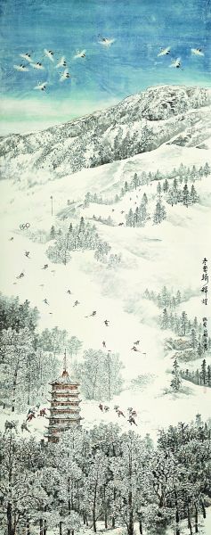 2022年冬奧會(huì)即將在北京舉行。延慶素有北京夏都之美譽(yù),作為冬奧會(huì)的賽區(qū)之一,備受期待。方政和、魏葵描繪的《冬奧鑄輝煌》是藝術(shù)家對(duì)冬奧會(huì)的暢想之作;┑娜宋稂c(diǎn)綴入景,萬里碧空與皚皚白雪相互呼應(yīng),空中盤旋的飛鶴則表達(dá)了對(duì)冬奧會(huì)的美好祝福。