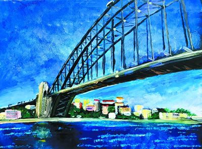 乍見《美麗山城》這件作品,仿佛有北宋畫家范寬《溪山行旅圖》的意味。畫中整體造型儼然一座雄奇壯麗的大山,飽滿的構圖迫近我們的眼簾,但真真切切,這卻是一幅表現(xiàn)山城重慶的黑白版畫。小作者王寶郁是重慶人,每天都在感受山城的變化。但見畫面山中有山,樹中疊樹,間于建筑、道路、橋梁、隧道,視覺效果微妙而豐富。從江面立出的高架路,以及行駛的輕軌列車和公路上的車輛,刻畫精細,顯示了山城的現(xiàn)代化面貌,讓我們深深感受到小作者對美好家園的喜愛。