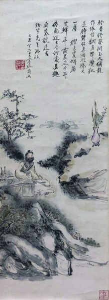 圖中,黃賓虹所繪鐘馗絡腮胡子,著長袍便服,端坐于幾案旁。鐘馗面目并不十分清晰,但神態(tài)自若,右手倚靠在案上,左手垂放于膝蓋。作者以簡潔的線條勾畫出人物輪廓,再以其一如既往的厚重筆墨,加以淡色與水墨渲染,粗率而不失神韻。幾案上,陳設有筆筒、硯臺及畫卷,而在另一旁的山石上,則有一只帶木質底座的花瓶,瓶中插著蒲草與艾葉等應景之物。在鐘馗前側,為山石與草木,淹潤華滋;后側為樹木及若隱若現(xiàn)的遠山。事實上,鐘馗只占據不到五分之一的畫面,整幅畫既是一幅人物畫,也是一幅山水畫,是黃賓虹成熟時期的山水畫風格。如果不是黃賓虹的題詩,畫中人物也許只是一個虛構的文人高士,像黃賓虹其他山水畫一樣作為襯景而存在,觀者未必能將其與鐘馗聯(lián)系起來。