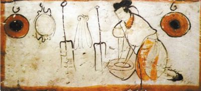 磚畫中見(jiàn)到不少切肉、揉面、烹煮及表現(xiàn)廚房設(shè)備的圖像。切肉有時(shí)為男子擔(dān)任,而烹食則基本由女仆掌管。另外有畫面繪兩個(gè)男子各跪在一個(gè)小案前,左手握刀,正在切肉,切好的肉放在案下的容器中。還有畫面描繪一個(gè)在盆中揉面的女子,她身后的墻上還懸掛著鐺、箕、炙叉等廚具。