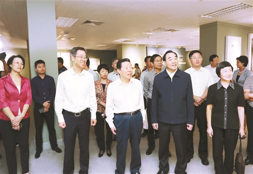 中共中央黨校(國家行政學(xué)院)副校(院)長王東京宣布展覽開幕,中國海關(guān)總署原署長于廣洲,全國政協(xié)常委、全國婦聯(lián)原副主席、書記處書記趙東花,全國政協(xié)原常委、林業(yè)部原副部長劉廣運(yùn),中國文聯(lián)原副主席楊承志,全國政協(xié)原常委、中國文聯(lián)原副主席、中央電視臺(tái)原臺(tái)長趙化勇,中共中央黨校(國家行政學(xué)院)圖書和文化館副館長劉俊瑞,中國書協(xié)原副主席胡抗美,中央電視臺(tái)原副總編輯趙立凡,張立辰、李小可、管峻等著名藝術(shù)家,市委書記、市人大常委會(huì)主任周鐵根,市委副書記、市長莊兆林,市委常委、宣傳部部長馮其譜,市人大常委會(huì)副主任李君超,副市長李燕,市政協(xié)副主席陳萍,市政協(xié)原副主席、彭城畫派研究會(huì)會(huì)長張愛軍等出席開幕式。馮其譜主持開幕式。