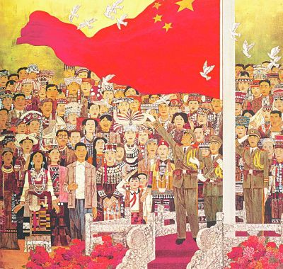 “我們?nèi)f眾一心,冒著敵人的炮火,前進,前進,前進進。”正像尚可、陳世寧、張承志、許朝暉的漆畫《萬眾一心》所描繪的場景一樣,國旗飄揚,白鴿飛舞,五十六個民族的中華兒女萬眾一心,昂首仰望。鮮艷的五星紅旗,是號召沖鋒的旗幟,是炎黃子孫心中燃燒的火焰,是盛世中奮進的夢想。