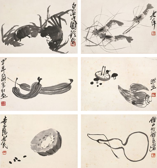 在藝術(shù)上,齊白石主張“妙在似與不似之間,太似為媚俗,不似為欺世”。他衰年變法后繪畫風(fēng)格逐漸褪去徐渭、朱耷、昊昌碩等人的風(fēng)格和筆法,形成獨(dú)特的大寫意墨彩風(fēng)格,開紅花墨葉一派。這種藝術(shù)風(fēng)格的轉(zhuǎn)變在齊白石的題識(shí)中亦可見出。如他在《酒食圖》題識(shí)中寫道:“寄萍堂上老人齊璜,此立幅乃予初來京華時(shí)棄去八大變?nèi)绱水嫹,殊可惜也?rdquo;