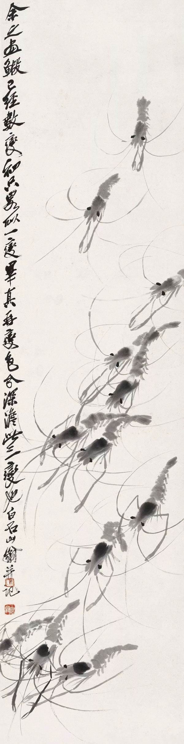 題跋:余之畫蝦已經(jīng)數(shù)變,初只略似,一變畢真,再變色分深淡, 此三變也。白石山翁并記。 鈐。耗救(朱文) 白石翁(白文)