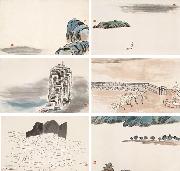 1902年,齊白石開啟了歷時(shí)八年(1902-1909年)的“五出五歸”遠(yuǎn)游之路。他走過了大半個(gè)中國,飽覽祖國山河美景,結(jié)識(shí)了很多文人名士,品鑒了大量名家名作,自此眼界大開。1910年,結(jié)束遠(yuǎn)游回到家鄉(xiāng),將游歷得來的山水畫稿重新繪制,匯編成《借山圖》,共52幅,后來多有散佚,北京畫院現(xiàn)藏有22幅。這套《借山圖》冊頁取材于遠(yuǎn)游中真實(shí)山水的寫生稿,屬于實(shí)景山水作品,體現(xiàn)了中國畫意象的簡約表達(dá)。遠(yuǎn)游之前,齊白石的山水畫主要以《芥子園畫譜》和明末清初的“四王”的山水風(fēng)格為主。憑借遠(yuǎn)游之機(jī),齊白石以自己獨(dú)特的方法將原型山水進(jìn)行了概括和提煉,初步形成自家山水面貌與風(fēng)格。