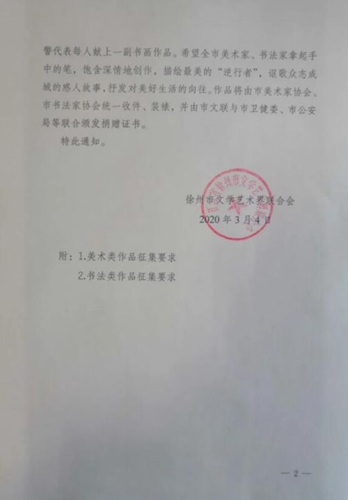 四、捐贈數量每人1-2幅五、作品附件隨作品附A4紙注明:書體、釋文、作者姓名、聯(lián)系電話、個人簡介(100字左右)等。捐贈作品請于2020年3月18日(9:30—16:00)送至李可染藝術館交臧海洋老師;無法直送的,3月18日前郵寄至市書協(xié),地址:徐州市云龍區(qū)建國東路廣大北巷16號李可染藝術館,聯(lián)系人:臧海洋,電話:13952198761。時間、地點如有變動,另行通知。