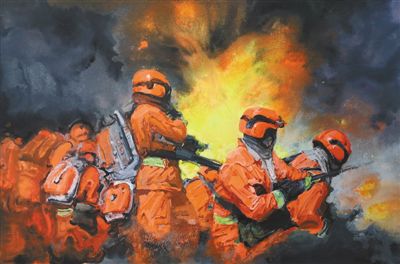 陸慶龍水粉畫《烈火英雄》——鮮亮的橙色,閃動(dòng)著消防人無(wú)懼危險(xiǎn)、逆行而上的精神之光,它照亮希望,給人生命的力量。 |