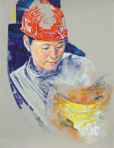 應(yīng)金飛色粉畫《女焊將》——純凈的藍(lán)色,映照出廣大工人敬業(yè)愛崗的模樣。技術(shù)工人隊(duì)伍是支撐中國(guó)制造、中國(guó)創(chuàng)造的重要基礎(chǔ),凝聚起同心筑夢(mèng)的磅礴力量。 |