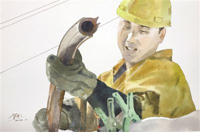 蔣智南水彩畫《行走在高壓線上》——醒目的黃色,在他們身上成為安全提示的警戒“信號(hào)”。保障萬(wàn)家燈火,正是電力工人的使命與擔(dān)當(dāng)。 |