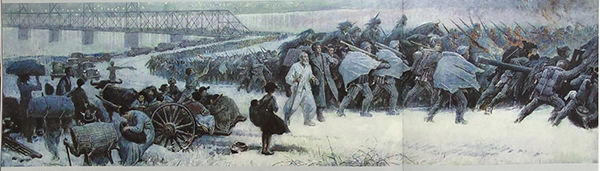 《跨過鴨綠江》是油畫家侯一民創(chuàng)作的描繪中國人民志愿軍開赴朝鮮戰(zhàn)場的歷史油畫。侯一民曾在接受記者采訪時回憶,這是他親身經(jīng)歷的事情,當(dāng)時他作為戰(zhàn)地記者,在那里待了一個冬天。