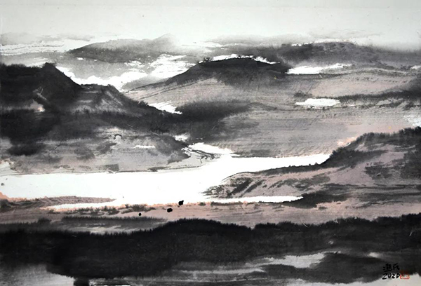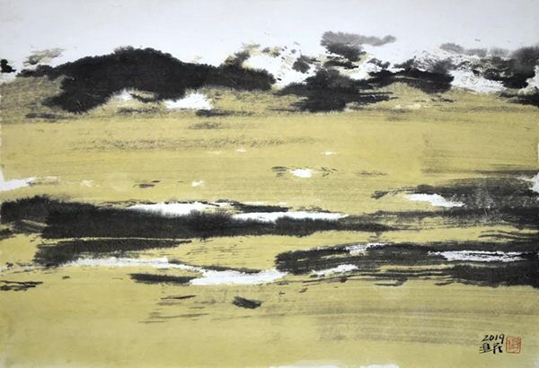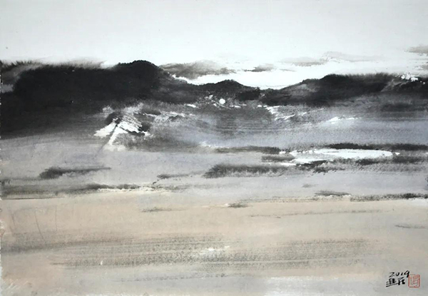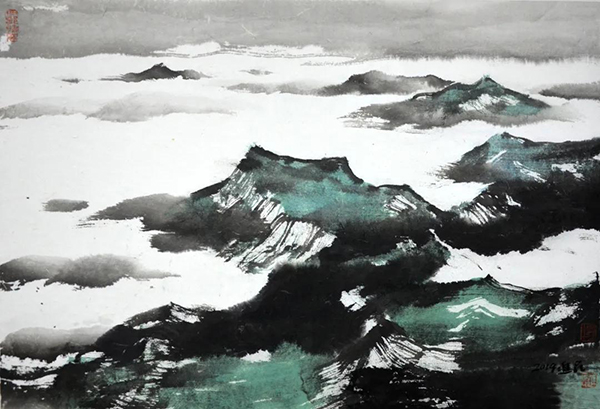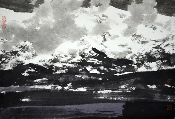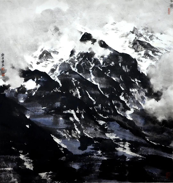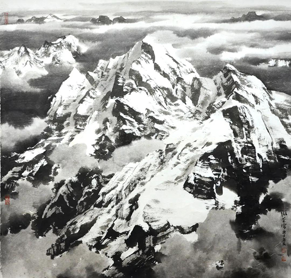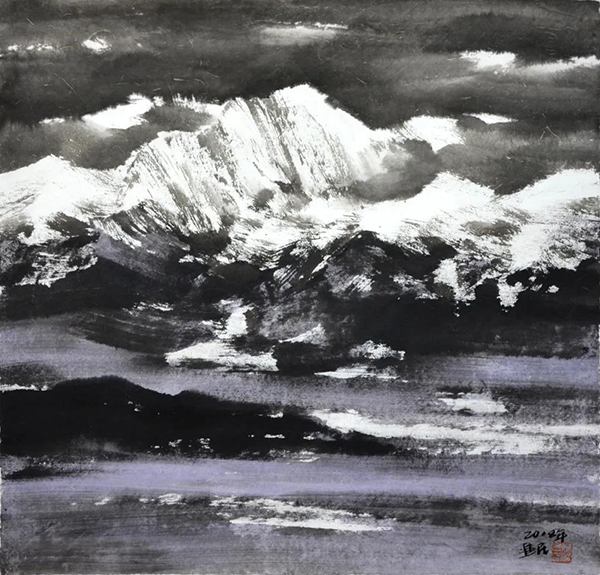 肖映川、楊進(jìn)民、張明川、陳芳桂四位畫家,都有從軍經(jīng)歷,有些還是現(xiàn)役軍人,又都師從于李寶林先生,對于蒼莽、雄強、峻偉、荒寒的西北大山水,陡然能起“男兒何不帶吳鉤,收取關(guān)山五十州”的壯志豪情。他們筆下的西部山水,已然超越了中國美術(shù)史的經(jīng)驗,超越了關(guān)隴山水為極限的所謂北派山水,目光掠過秦嶺,直探地球第三極和有“萬山之祖”稱號的帕米爾高原!這是人煙罕至的絕地,許多地域被稱為“人類禁區(qū)”,文明不曾染指,所以也稱為地球最后的凈土。這樣的對象,是中國山水畫的新課題。從知識的角度看,它們已經(jīng)不屬于人類的盲區(qū),但如何經(jīng)由畫家的心眼化其為藝術(shù)的心象,賦其以圖式的表達(dá),且以筆墨奪其山魂水魄,然后造化在乎手,將人類文明的化外之域,化為紙上丘壑煙云與筆墨圖式,映照人類永無止境的探險精神和求索心性,開拓人類在空間視域的經(jīng)驗與新的表達(dá)能力,就是畫家們的藝術(shù)使命了。我欣喜地看到四位有軍人氣質(zhì)的山水畫家在這片絕地上的頑強開拓,他們筆下的每一座寒光凜凜的冰峰,每一道深不見底的大壑,每一片靈異的天空,每一塊亙古的頑石,都給我靈魂的震撼,讓我對造化充滿敬畏并心生感激。天覆地載,天地有大美而不言。誠哉斯言!