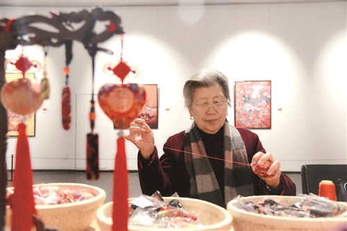 徐州香包非遺傳承人王秀英與她的弟子在徐州美術(shù)館大廳展示了數(shù)十種特色香包,色彩明快的香包與展廳四周的年畫(huà)色調(diào)相合,王秀英戴著老花鏡一針一線地縫制香包,吸引了眾人觀看。