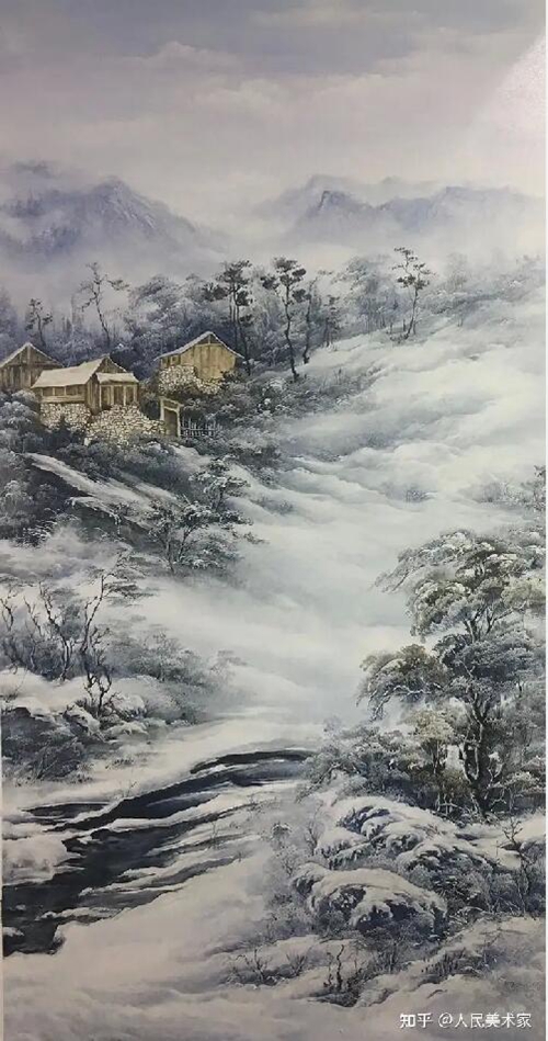 冬季風(fēng)景,北鴻大師用精心處理的構(gòu)圖,細(xì)致的筆觸,變化微妙的色彩描繪出來(lái),并捕捉到寒冷中的一抹帶來(lái)生機(jī)的暖意,使風(fēng)景畫十分生機(jī)勃勃。