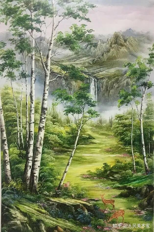 幽靜浪漫的溪流景色,讓心情平靜下來(lái)。畫家通過滿眼的青綠色來(lái)表現(xiàn)一種山清水秀,空氣清新的抒情畫面。