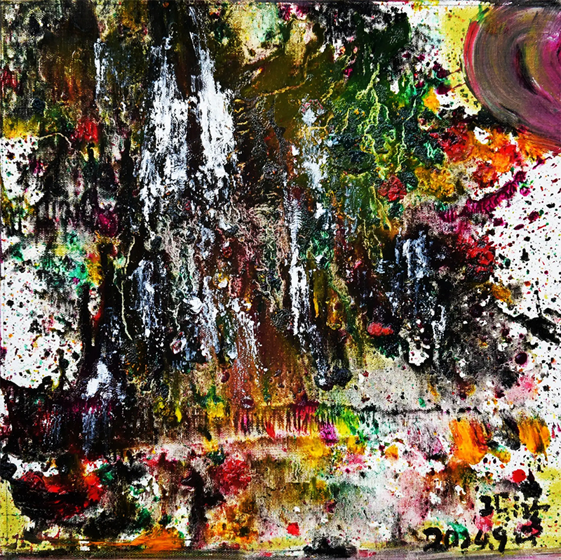 北鴻運(yùn)用其獨(dú)特的潑灑油彩和飛動(dòng)筆勢(shì)技法,將飛流直下的瀑布與情人的堅(jiān)定情感相結(jié)合。他們一同欣賞飛流直下的瀑布,感受著大自然的磅礴與力量,也讓他們的愛(ài)情更加堅(jiān)定與執(zhí)著。