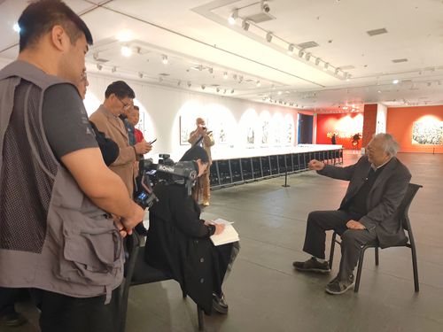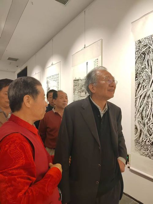 陳傳席教授以76歲高齡,不顧病痛,在馬培童先生的陪同下,一步步走遍三大展廳,在一幅幅畫作前駐足鑒賞,無一遺漏,令參觀者十分感動。參觀結(jié)束后,他又接受了媒體的采訪,耐心地回答了記者的提問。