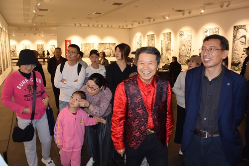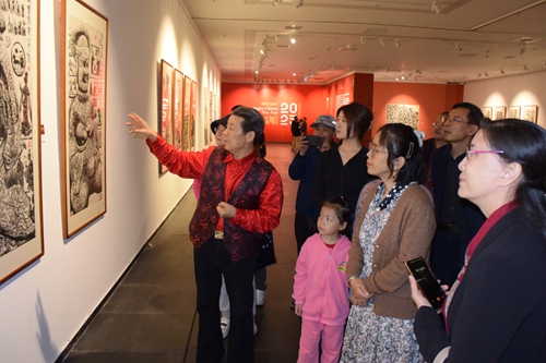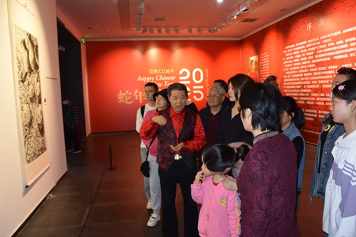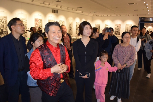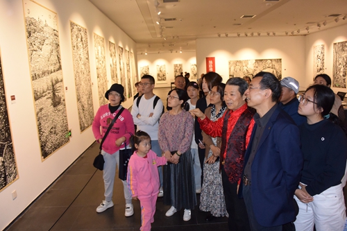 馬培童的創(chuàng)作過程本身即是一場(chǎng)行為藝術(shù):當(dāng)他以刻刀般的筆鋒鑿開宣紙表層時(shí),觀眾能直觀感受到“歷史表皮”被剝離的瞬間。現(xiàn)場(chǎng)墨跡的凝固過程仿佛文明基因的顯影——徐州漢畫像石的樸拙氣韻在焦墨中重生,摩崖石刻的殘損邊界通過飛白筆法獲得新生。這種“筆墨考古”的創(chuàng)作模式,使觀者不僅見證畫作誕生,更親歷了文化記憶從物質(zhì)遺存向藝術(shù)符號(hào)轉(zhuǎn)譯的在場(chǎng)性體驗(yàn)。