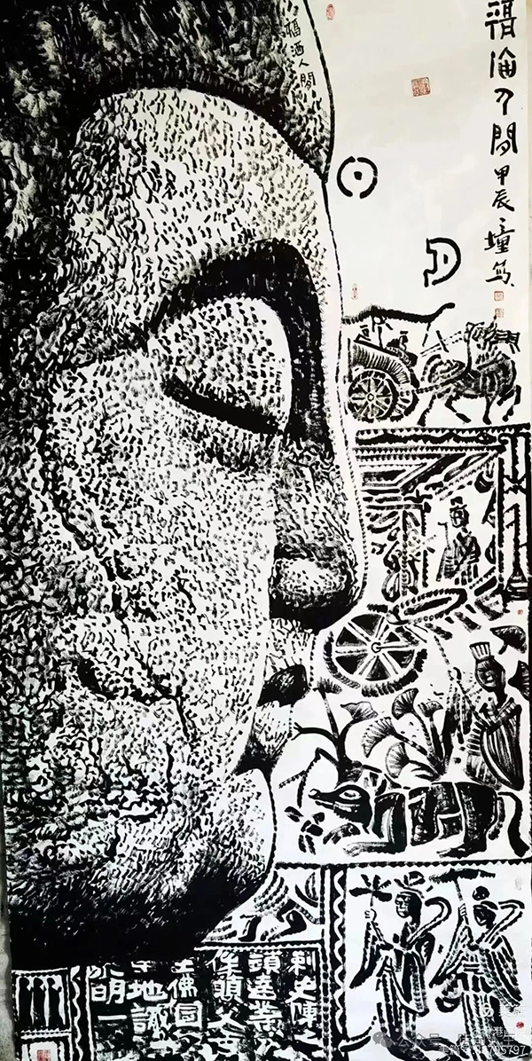 陳傳席指著一幅焦墨佛像,眼睛里閃著光:“你看他這線條,有的是刻石皴,有的是毛毛蟲皴!把毛毛蟲的卷曲感變成筆意,這腦洞,絕了!” 更絕的是,他還把古錢、佛像甚至埃及文物的元素,都當(dāng)成皴法用進(jìn)畫里——別人畫畫是“創(chuàng)作”,他是把古今中外的文化符號(hào)“煮”成了一碗藝術(shù)濃湯!
