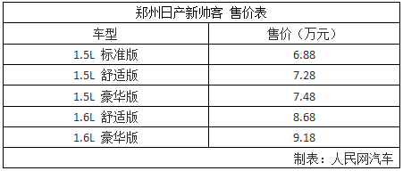 人民網(wǎng)廣州11月20日電(鄂智超)在2015廣州國際車展上,鄭州日產(chǎn)正式發(fā)布了新款帥客,并公布新車的售價為6.88萬至9.18萬元,具體車型與價格請見下表。