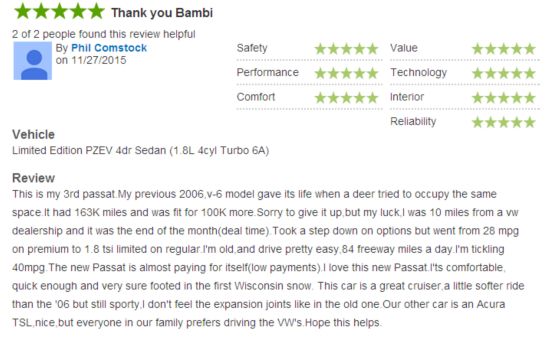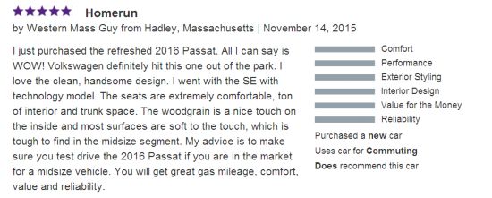 網(wǎng)友Western Mass Guy給出的評(píng)分是5分,對(duì)舒適度,性能,外觀內(nèi)飾設(shè)計(jì),物有所值度和可靠性方面的評(píng)價(jià)都是五顆星。“我剛買了最新版的帕薩特。很想說大眾這款車卓爾不群。非常喜歡它的外表,簡(jiǎn)潔而美觀。座椅舒適,內(nèi)部空間和后備箱尺寸都足夠大。木質(zhì)裝飾摸上去手感很好,這在中級(jí)轎車?yán)锖芎币。如果你想買一輛中級(jí)轎車我建議你去試駕2016款帕薩特,你會(huì)發(fā)現(xiàn)油耗,舒適度,價(jià)值度以及可靠性都很棒。”