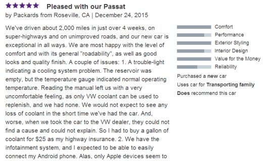 來自美國(guó)口碑網(wǎng)站cars的網(wǎng)友Packards給帕薩特的評(píng)價(jià)是五顆星,他對(duì)舒適度,外觀設(shè)計(jì),物有所值度的評(píng)價(jià)是5分,對(duì)性能,內(nèi)飾設(shè)計(jì)的評(píng)價(jià)是4分,而對(duì)可靠性的評(píng)價(jià)僅為3分。“目前我們已經(jīng)開了四個(gè)星期共2000英里,無論是高速還是不平坦的道路都去試過了,總的來說這是輛很好的車。我們對(duì)這款車的舒適度非常滿意,尤其是它對(duì)道路的適應(yīng)性非常棒。而且外觀很好看,做工質(zhì)量也不錯(cuò)。”車主說。不過車主也總結(jié)了這款車的幾個(gè)缺點(diǎn):首先,“冷卻液已經(jīng)空了,但是溫度計(jì)卻顯示正常的溫度。送到經(jīng)銷商店里,他們也找不到原因。于是我只能花25美元買了一加侖的冷卻液。第二個(gè)問題是盡管有娛樂系統(tǒng),但是不能連接到我的安卓手機(jī)。后來才發(fā)現(xiàn),只能用蘋果的。第三個(gè)問題是雖然裝有霧燈,但還是說明書里寫的步驟不管用。還有一個(gè)問題是油耗。我的是1.8L版本,跟廣告說的38mpg油耗差的太遠(yuǎn)了。”車主表示,盡管車還算挺好的,但是感到有一些失望。