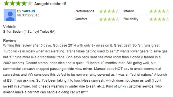 網(wǎng)友14freud給帕薩特的評(píng)分是4分,他給性能,內(nèi)飾,舒適度和可靠性的評(píng)價(jià)均為四顆星。車主剛買了二手8000英里的2014款帕薩特,開了五天以后來寫個(gè)口碑。“這個(gè)買賣太值了!目前來說開起來感覺很棒,有了渦輪增壓,加速更快了。兒子說后排座椅比本田的要大(我剛賣了2002款雅閣)。體面地音響設(shè)備,駕駛體驗(yàn)很好,而且很安靜。”車主在開了10個(gè)月以后追加了口碑。“還不錯(cuò),但是側(cè)玻璃窗在洗車的時(shí)候壞了,大眾認(rèn)為這不屬于保修范圍,認(rèn)為只是‘自然行為’這種客戶服務(wù)實(shí)在差勁。那個(gè)車企車,車玻璃是洗車就能損壞的?”