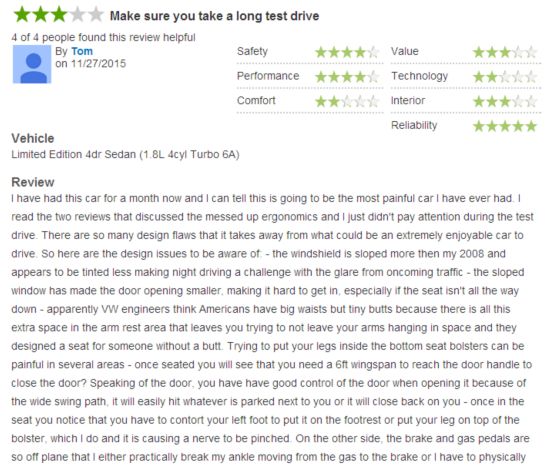 網(wǎng)友Tom擁有一款1.8L limited版本的帕薩特,他給出的總體評(píng)分是3分,他給可靠性的評(píng)價(jià)是五顆星,對(duì)安全性,性能的評(píng)價(jià)是四顆星,對(duì)價(jià)值度,內(nèi)飾設(shè)計(jì)的評(píng)價(jià)是三顆星,對(duì)技術(shù)和舒適度的評(píng)價(jià)是兩顆星。“這款車我已經(jīng)開了一個(gè)月了,我敢說一定是一輛讓我頭疼的車。看完關(guān)于兩個(gè)說人機(jī)工程學(xué)設(shè)計(jì)方面有問題的評(píng)價(jià)后,發(fā)現(xiàn)試駕的時(shí)候沒注意這兩個(gè)問題,因?yàn)檫@款車設(shè)計(jì)上的瑕疵實(shí)在太多了。下面我總結(jié)一下設(shè)計(jì)上的問題:1.擋風(fēng)玻璃的傾斜角度大于2008款車型,讓夜間行車變成一種更嚴(yán)峻的挑戰(zhàn),而且車門只能開的更小,難道大眾工程師認(rèn)為美國(guó)人腰粗屁股小嗎,車?yán)餅楦觳仓庾恿袅俗銐虻目臻g而屁股卻沒地方放。而且把腿放進(jìn)車?yán)镆埠苜M(fèi)勁,坐下以后發(fā)現(xiàn)還要伸長(zhǎng)了臂膀去關(guān)門。2. 剎車和油門踏板根本不在一個(gè)平面上,腳踝在剎車和油門踏板間來回移動(dòng)感覺要斷了。”車主還列舉了許多設(shè)計(jì)上的問題。最后他說“總的來說開起來是輛好車,但是設(shè)計(jì)的問題影響了舒適度,這或許是我最后一輛帕薩特了。”