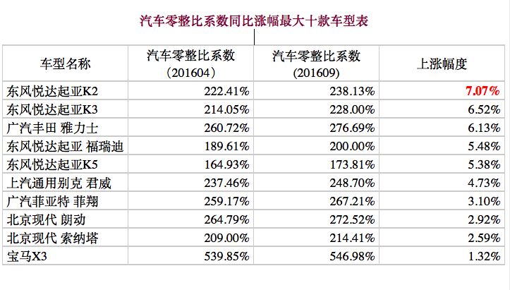 兩協(xié)會(huì)選取了國內(nèi)保有量最大、上一年度銷售數(shù)量居前、品牌代表性較高的常見100個(gè)車型作為樣本,得出數(shù)據(jù)顯示,截止今年9月,汽車零整比系數(shù)最高的車型分別是北京奔馳 GLK 級 (861.10%)、北京奔馳 GLA 級 (786.81%)、北京奔馳 C級三廂(704.41%)、北京奔馳E 級三廂(623.23%)及華晨寶馬X1(602.72)。
