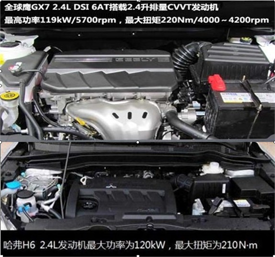 全球鷹GX7和哈弗H6都提供了2.4L排量的車型。全球鷹搭載的是吉利自主研發(fā)的Cvvt發(fā)動機,而哈弗H6搭載的發(fā)動機源自三菱的4G系列。從動力參數(shù)上看,兩款發(fā)動機不分高下,最高功率上1kW的差別真的是微乎其微。但得益于cvvt技術的應用,全球因GX7的百公里油耗僅為9.5L升,相比哈弗H6的10.4升占有優(yōu)勢。