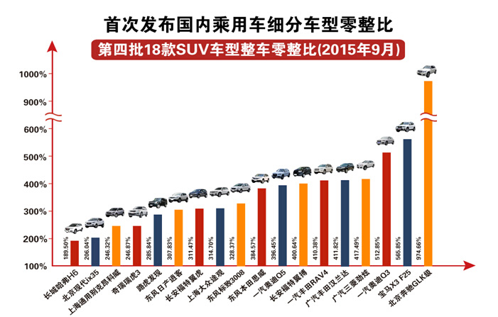 為此,兩協(xié)會首次開展國內(nèi)乘用車市場細分車型的零整比系數(shù)研究,依據(jù)銷量、保有量、熟知度選取了18款SUV車型測算零整比系數(shù),經(jīng)計算此次發(fā)布的18款車型中,零整比系數(shù)最高的車型為北京奔馳GLK級(12/04-),零整比系數(shù)為974.66%,零整比系數(shù)最低的車型為長城哈弗H6(11/08-),零整比系數(shù)為189.5%,零整比系數(shù)高低相差5.1倍。