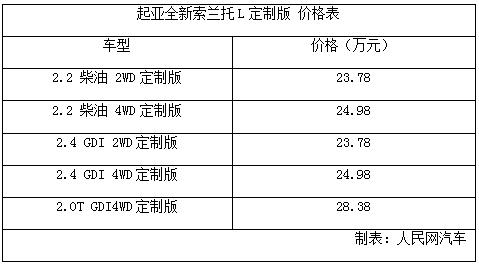 人民網(wǎng)北京11月5日電(鄂智超)記者從起亞汽車(chē)官方獲悉,起亞全新索蘭托L定制版正式上市,售價(jià)為23.78-28.38萬(wàn)元。新車(chē)在全新索蘭托L的基礎(chǔ)上進(jìn)行了配置升級(jí),售價(jià)則比此前的車(chē)型下降了1萬(wàn)元,具體價(jià)格請(qǐng)見(jiàn)下表。