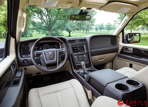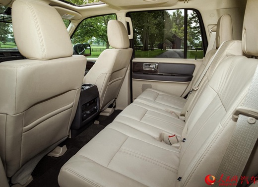 在內(nèi)飾設(shè)計(jì)上,林肯領(lǐng)航員大量采用了皮質(zhì)包裹的表面,車門內(nèi)側(cè)加入了諸多木質(zhì)紋理裝飾件。新款車采用了最新樣式的四輻方向盤,第二排座椅可選擇三座位或兩座位形式,后者在后排中央將多出儲(chǔ)物格以及娛樂系統(tǒng)控制按鍵。