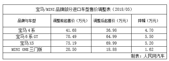 人民網(wǎng)北京5月25日電(鄂智超)為響應(yīng)關(guān)于降低汽車整車以及零部件進口關(guān)稅的通告,寶馬中國宣布對旗下銷售的寶馬與MINI品牌進口汽車進行價格調(diào)整,5月24日起開始執(zhí)行。其中,已公布的寶馬4系與6系GT車型的起售價分別降低了4.7萬元與5.5萬元,X5起售價降幅為5.2萬元,MINI車系的起售價降低1.62萬元。