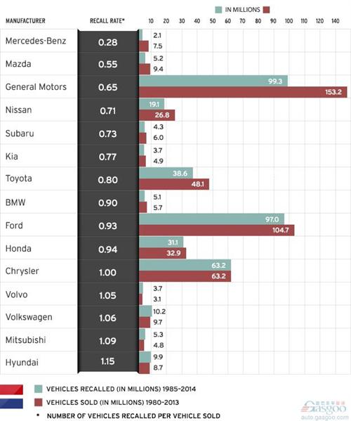 iSeeCars.com網(wǎng)站以美國國家公路交通安全管理局NHTSA數(shù)據(jù)為基礎(chǔ),統(tǒng)計了從1985年到2014年(未完成)這30年間,15家主流車企在美國累計召回量(編者注:嚴格意義上單位是“輛次”);然后對比1980年到2013年的銷量,得到召回率,即每單位銷量的召回量(Number of vehicles recalled per vehicle sold)。