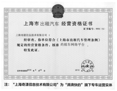 “昨天,記者從《約租車(chē)(專(zhuān)車(chē))模式上海創(chuàng)新與實(shí)踐》論壇上獲悉,上海市交通委已向滴滴快的發(fā)出專(zhuān)車(chē)經(jīng)營(yíng)證書(shū)。這是國(guó)內(nèi)第一張專(zhuān)車(chē)平臺(tái)的資質(zhì)許可,滴滴快的也成為第一家獲得網(wǎng)絡(luò)約租車(chē)平臺(tái)經(jīng)營(yíng)資質(zhì)的公司。這意味著,上海市在國(guó)內(nèi)率先拉開(kāi)專(zhuān)車(chē)規(guī)范化序幕。”