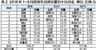 今年1-9月份,中國汽車市場總銷量為1705.65萬輛,與去年同期相比增長了0.31%;其中,乘用車累計銷量為1454.78萬輛,同比增長2.75%。在轎車、SUV、MPV和交叉型乘用車四大類乘用車品種中,SUV以累計銷量408.42萬輛、同比增長46.68%保持高速增長;MPV產(chǎn)銷增速與上年同期相比分別為8.4%和8.2%;轎車產(chǎn)銷則分別下降10.7%和8.8%;交叉型乘用車產(chǎn)銷分別下降20%和20.9%。
