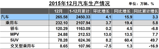 據(jù)中汽協(xié)統(tǒng)計,乘用車的銷量在2015年首次超過2000萬輛,為2114.63萬輛,同比增長7.3%。其中,同比增長最為明顯的是SUV車型同比增長49.65%;其次增速較快的為MPV車型,同比增長10.05%。