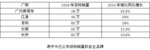 2016年新年伊始,各家車企便公布了2016年的銷量目標,立下軍令狀。不同于之前的高增長,車市自2015年已經(jīng)進入了微增長狀態(tài),不過大部分的自主品牌還是斗志昂揚,2016年的目標銷量與去年同期相比基本都是10%以上的增幅,預期普遍高于合資車企。