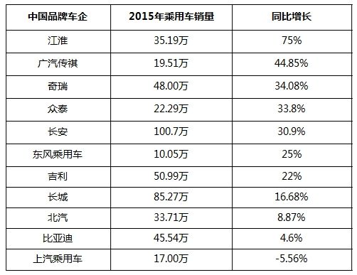 2015年汽車銷量終于出爐,數(shù)據(jù)顯示,全國(guó)乘用車銷量2114.63萬(wàn)輛,增長(zhǎng)7.3%,與前幾年相比大為縮水。其中,中國(guó)品牌在過(guò)去一年成績(jī)搶眼,基本上完成年度銷量目標(biāo)。按增長(zhǎng)速度來(lái)看,絕大部分中國(guó)品牌增長(zhǎng)均超過(guò)乘用車7.3%的水平,長(zhǎng)安、奇瑞、廣汽傳祺等增長(zhǎng)均超過(guò)30%,而江淮更是以增速超75%成為增長(zhǎng)最快的車企。按規(guī)模來(lái)看,長(zhǎng)安、長(zhǎng)城等銷量甚至超過(guò)合資車企。