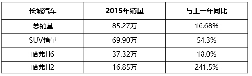 長(zhǎng)城汽車在2015年度總銷量雖然不是第一,但其去年全年累計(jì)銷量85.27萬(wàn)臺(tái),同比增長(zhǎng)16.68%,超額完成銷售目標(biāo)。過(guò)去一年,長(zhǎng)城汽車穩(wěn)穩(wěn)抓住SUV市場(chǎng)的機(jī)會(huì),哈弗系銷量達(dá)69.90萬(wàn)臺(tái),為母品牌貢獻(xiàn)八成銷量。