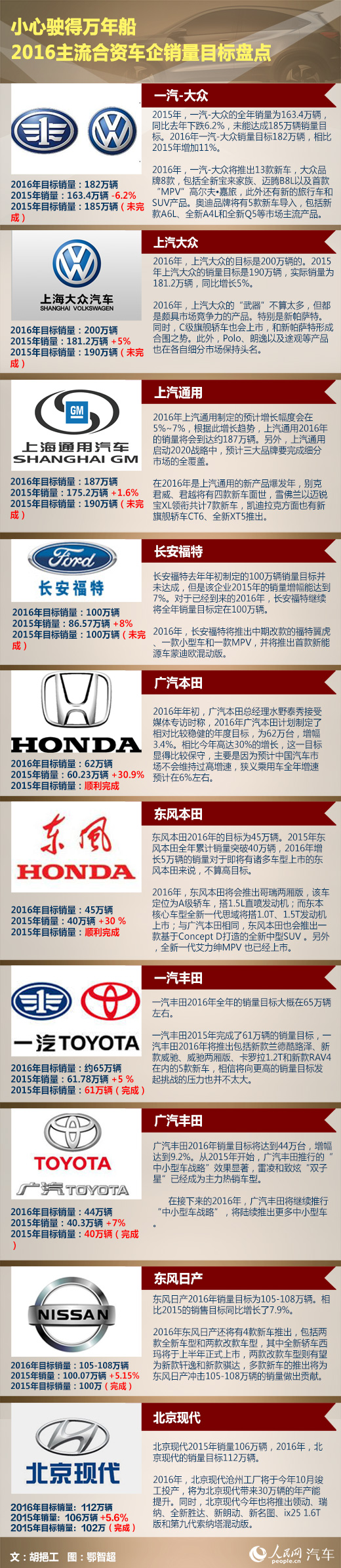 縱觀已經(jīng)過(guò)去的2015年,各家車(chē)企的銷(xiāo)量大多都舉步維艱,從近幾年的汽車(chē)消費(fèi)市場(chǎng)的趨勢(shì)來(lái)看,2016年中國(guó)汽車(chē)市場(chǎng)也不會(huì)維持高速增長(zhǎng),狹義乘用車(chē)全年增速預(yù)計(jì)在6%左右。在此大形勢(shì)下,2016年各家車(chē)企制定的銷(xiāo)量目標(biāo)均將為保守,本期我們先一起看看國(guó)內(nèi)主流合資汽車(chē)品牌的銷(xiāo)量目標(biāo)。