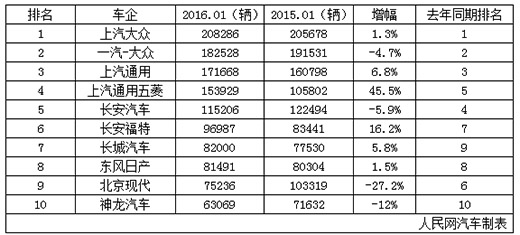 人民網(wǎng)北京2月14日電(涂欽瀚)日前,乘聯(lián)會(huì)發(fā)布了1月乘用車銷量最新數(shù)據(jù)。2016年1月狹義乘用車零售2,288,588輛,同比2015年1月增長15%,與2015年12月基本持平。另外,根據(jù)乘聯(lián)會(huì)數(shù)據(jù)整理,2016年1月份國內(nèi)狹義乘用車銷量前十名企業(yè)與去年保持不變,但在席位排名上有較大的變化。上汽大眾、一汽-大眾和上汽通用仍是三巨頭,上汽通用五菱增長最快。但與去年同期相比,也有4家同比下滑,分別是一汽-大眾、長安汽車、北京現(xiàn)代和神龍汽車,其中北京現(xiàn)代同比跌幅最大,達(dá)到了近三成。