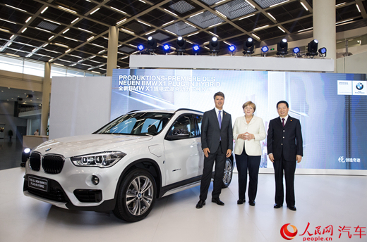 右起:遼寧省省長陳求發(fā)、德國總理默克爾、寶馬集團(tuán)董事長科魯格共同啟動(dòng)全新BMW X1插電式混合動(dòng)力下線儀式
